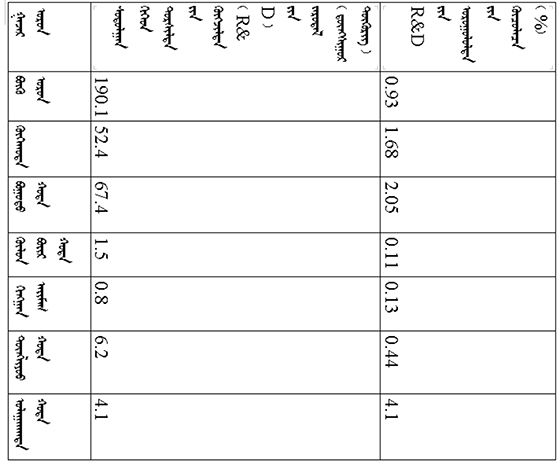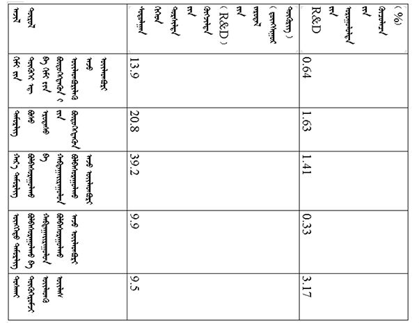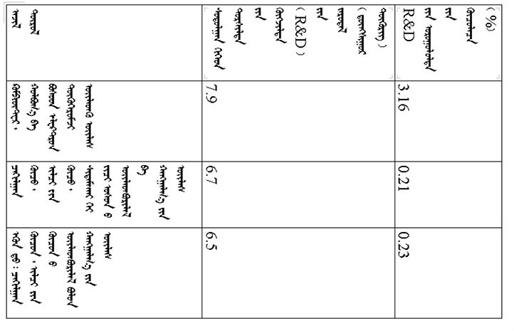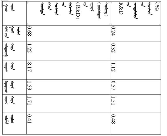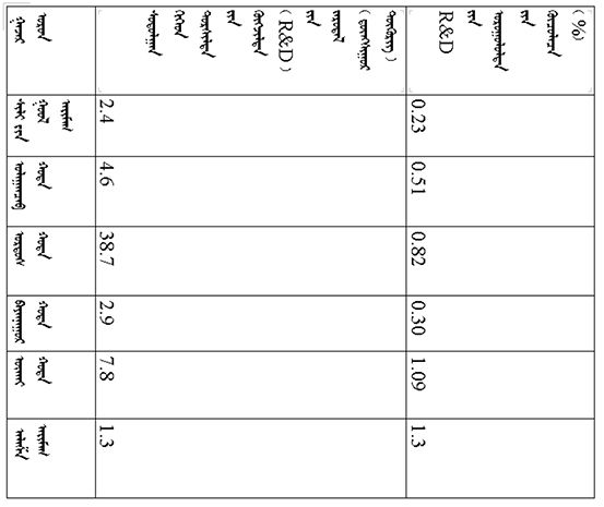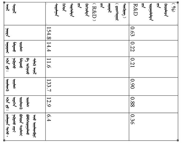 ᠠᠵᠤ ᠦᠢ᠍ᠯᠡᠰᠤᠨ ᠰᠠᠯᠠᠭᠠ ᠮᠥᠴᠢᠷ ᠬᠤᠪᠢᠶᠠᠵᠤ ᠦᠵᠡᠪᠡᠯ᠂ ᠳᠡᠭᠡᠳᠦ ᠮᠡᠷᠭᠡᠵᠢᠯᠤᠨ ᠦᠢ᠍ᠯᠡᠳᠬᠦ ᠦᠢ᠍ᠯᠡᠰᠤᠨ ᠰᠤᠳᠤᠯᠭ᠋ᠠᠨ ᠪᠠ ᠲᠤᠷᠰᠢᠯᠲᠠ ᠵᠢᠨ ᠬᠥᠭᠵᠢᠯᠲᠡ (R&D) ᠵᠢᠨ ᠵᠠᠷᠤᠳᠠᠯ 12.6 ᠳ᠋ᠦᠩᠰᠢᠭᠤᠷ ᠲᠥᠭᠥᠷᠢᠭᠲᠤ ᠬᠦᠷᠴᠦ᠂ ᠲᠦᠷᠦᠭᠦᠦ ᠵᠢᠯᠤᠨᠬᠢᠠᠴᠠ 5.1 ᠳ᠋ᠦᠩᠰᠢᠭᠤᠷ ᠲᠥᠭᠥᠷᠢᠭ ᠨᠡᠮᠡᠭᠳᠡᠨ᠂ 67.7%ᠪᠠᠷ ᠨᠡᠮᠡᠭᠳᠡᠵᠦ᠂ ᠣᠷᠣᠭᠤᠯᠤᠯᠲᠠ ᠵᠢᠨ ᠡᠷᠴᠢᠮ (ᠡᠵᠡᠩᠨᠡᠯᠲᠡ ᠵᠢᠨ ᠣᠷᠣᠯᠭᠠ ᠵᠢᠨ ᠬᠠᠷᠢᠴᠠᠯ)ᠨᠢ 2.47% ᠪᠠᠶ᠋ᠢᠵᠤ᠂ ᠲᠦᠷᠦᠭᠦᠦ ᠵᠢᠯᠤᠨᠬᠢᠠᠴᠠ 0.69 ᠵᠠᠭᠤᠨᠤ ᠬᠤᠪᠢ ᠵᠢᠨ ᠴᠡᠭ ᠳᠡᠭᠡᠭᠰᠢᠯᠡᠪᠡ; ᠲᠣᠨᠣᠭᠯᠠᠯ ᠦᠢ᠍ᠯᠡᠳᠬᠦ ᠦᠢ᠍ᠯᠡᠰᠢ ᠰᠤᠳᠤᠯᠬᠤ ᠪᠠ ᠲᠤᠷᠰᠢᠯᠲᠠ ᠬᠢᠵᠦ ᠬᠥᠭᠵᠢᠭᠦᠯᠬᠦ (R&D) ᠵᠠᠷᠤᠳᠠᠯ 25.4 ᠳ᠋ᠦᠩᠰᠢᠭᠤᠷ ᠲᠥᠭᠥᠷᠢᠭᠲᠤ ᠬᠦᠷᠴᠦ᠂ ᠲᠦᠷᠦᠭᠦᠦ ᠵᠢᠯᠤᠨᠬᠢᠠᠴᠠ 4.4 ᠳ᠋ᠦᠩᠰᠢᠭᠤᠷ ᠲᠥᠭᠥᠷᠢᠭ ᠨᠡᠮᠡᠭᠳᠡᠨ᠂ 20.9%ᠪᠠᠷ ᠨᠡᠮᠡᠭᠳᠡᠵᠦ᠂ ᠣᠷᠣᠭᠤᠯᠤᠯᠲᠠ ᠵᠢᠨ ᠡᠷᠴᠢᠮᠨᠢ 2.40 % ᠪᠠᠶ᠋ᠢᠵᠤ᠂ ᠲᠦᠷᠦᠭᠦᠦ ᠵᠢᠯᠤᠨᠬᠢᠠᠴᠠ 0.21 ᠵᠠᠭᠤᠨᠤ ᠬᠤᠪᠢ ᠵᠢᠨ ᠴᠡᠭ ᠳᠡᠭᠡᠭᠰᠢᠯᠡᠪᠡ᠃ ᠬᠡᠪᠴᠢᠶᠡᠵᠢᠯᠠᠴᠠ ᠳᠡᠭᠡᠭᠰᠢᠬᠢ ᠠᠵᠤ ᠦᠢ᠍ᠯᠡᠳᠪᠦᠷᠢ ᠵᠢᠨ ᠠᠵᠤ ᠠᠬᠤᠶ᠋ᠢᠯᠠᠯ [3]ᠤᠨ ᠳᠣᠲᠣᠷᠠ᠂ ᠰᠤᠳᠤᠯᠭ᠋ᠠᠨ ᠪᠠ ᠲᠤᠷᠰᠢᠯᠲᠠ ᠵᠢᠨ ᠬᠥᠭᠵᠢᠯᠲᠡ (R&D) ᠵᠢᠨ ᠵᠠᠷᠤᠳᠠᠯᠤᠨ ᠣᠷᠣᠭᠤᠯᠤᠯᠲᠠ 5 ᠳ᠋ᠦᠩᠰᠢᠭᠤᠷ ᠲᠥᠭᠥᠷᠢᠭᠢ ᠳᠠᠪᠠᠭᠰᠠᠨ ᠠᠵᠢᠯ ᠲᠦᠷᠦᠯ 10 ᠪᠠᠶ᠋ᠢᠵᠤ᠂ ᠡᠨᠡ 10 ᠠᠵᠢᠯ ᠲᠦᠷᠦᠯᠤᠨ ᠵᠠᠷᠤᠳᠠᠯᠤᠨ ᠪᠦ᠍ᠬᠦ ᠬᠡᠪᠴᠢᠶᠡᠵᠢᠯᠠᠴᠠ ᠳᠡᠭᠡᠭᠰᠢᠬᠢ ᠠᠵᠤ ᠦᠢ᠍ᠯᠡᠳᠪᠦᠷᠢ ᠵᠢᠨ ᠠᠵᠤ ᠠᠬᠤᠶ᠋ᠢᠯᠠᠯᠤᠨ ᠰᠤᠳᠤᠯᠭ᠋ᠠᠨ ᠪᠠ ᠲᠤᠷᠰᠢᠯᠲᠠ ᠵᠢᠨ ᠬᠥᠭᠵᠢᠯᠲᠡ (R&D) ᠵᠢᠨ ᠵᠠᠷᠤᠳᠠᠯᠤᠨ ᠳᠣᠲᠣᠷᠠ ᠡᠵᠡᠯᠡᠬᠦ ᠬᠤᠪᠢ ᠵᠢᠨ ᠵᠢᠩᠨᠢ 89.6% ᠪᠤᠯᠤᠨᠠ (ᠳᠠᠭ᠋ᠠᠯᠳᠤᠭᠤᠯᠤᠯ ᠬᠦᠰᠦᠨᠦᠭᠲᠦ 1ᠳᠤ ᠦᠵᠡ)᠃